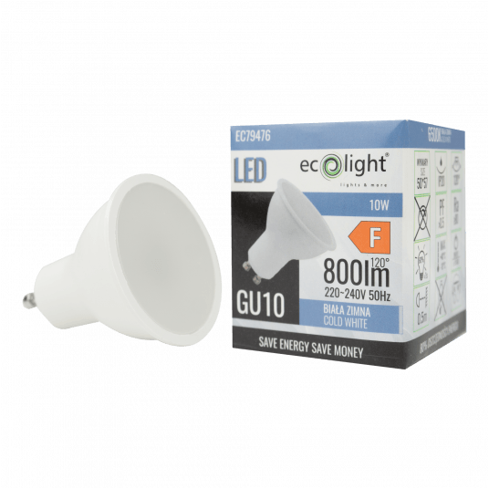 Żarówka LED GU10 to nowoczesny i energooszczędny produkt marki Eco Light, idealnie sprawdzający się w różnych zastosowaniach domowych i komercyjnych. Nadaje wnętrzu nowoczesny wygląd dzięki światłu o zimnej temperaturze barwowej 6500K i jasności 800lm. Mleczny klosz i szeroki kąt świecenia 120° równomiernie rozprowadzają światło, jednocześnie eliminując ostre cienie.