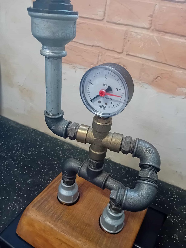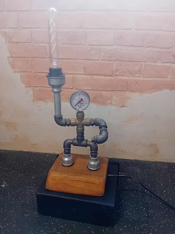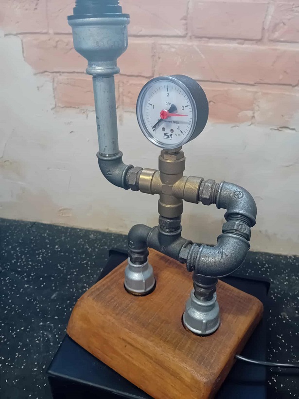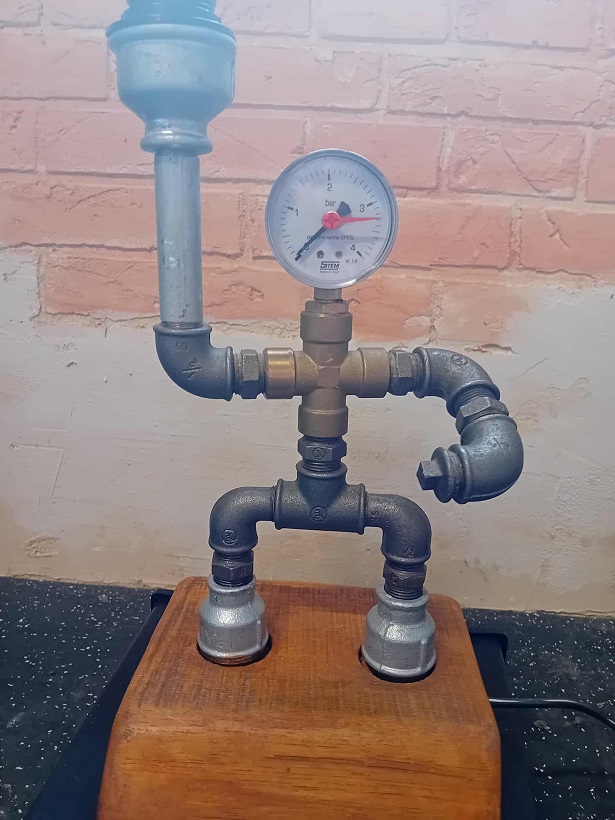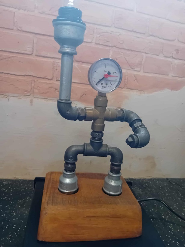 Lampa handmade w kształcie ludzika to oryginalna ozdoba pomieszczeń w stylu industrialnym. Zbudowana została z elementów hydraulicznych i umieszczona na drenianej podstwie.