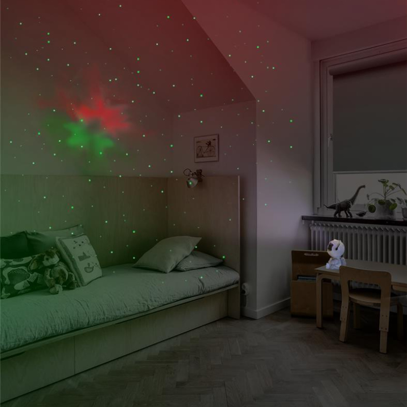 Dzięki LED RGB oraz laserowi klasy 2R (532 nm) lampa odwzorowuje wygląd nocnego nieba. Imitacja galaktyk tworzy hipnotyzujące wzory świetlne, które można dostosować pod kątem kolorów i intensywności. To idealny sposób na stworzenie relaksującej atmosfery w sypialni, pokoju dziecięcym czy salonie.