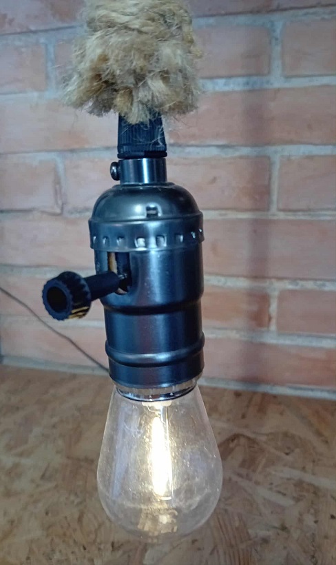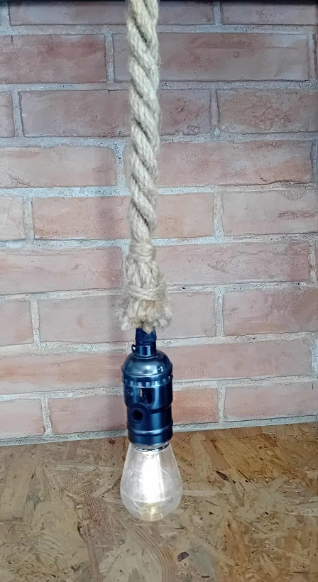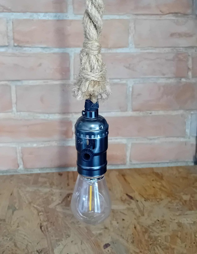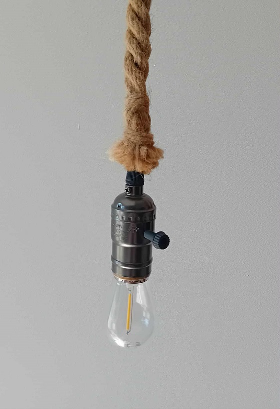 Lampa handmade zachwyca swoją prostotą i surowym designem. Zbudowana została z czarnej dekoracyjnej oprawki w stylu retro z włącznikiem światła on/off dostosowanej do żarówek z gwintem E27 oraz sznura jutowego. Skręcana lina tworzy wyjątkowy, rustykalny klimat, doskonale komponujący się z cegłą, drewnem i surowymi materiałami.
