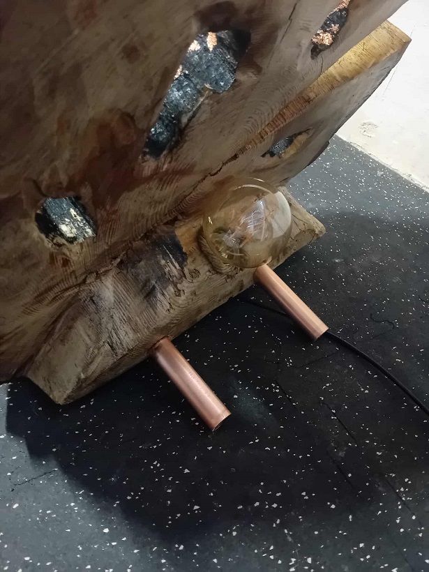 Lampa handmade z dużego plastra drewna to idealny dodatek do pomieszczeń w stylu naturalnym lub skandynawskim. Otwory w drewnie pięknie rozpraszają światło, dodając ciepłego blasku i tworząc przytulną atmosferę. Lampa opiera sie na dwóch metalowych nóżkach.