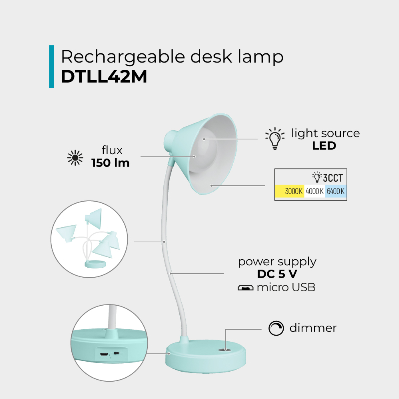 Lampka biurkowa LED ładowalna 150lm CCT miętowa