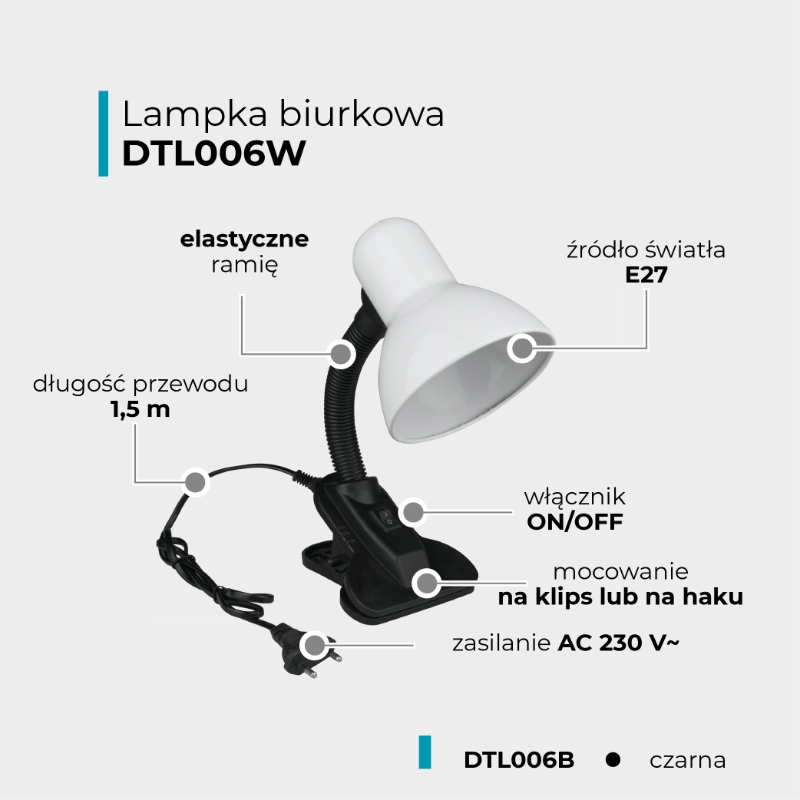 Ten model przystosowany jest do żarówek o gwincie E27 (brak w zestawie) o maksymalnej mocy 40W. Solidny klips umożliwia mocowanie produktu do różnych powierzchni. Regulowane ramię i długość przewodu wynosząca 1,5m gwarantuje dopasowanie do każdym potrzeb.