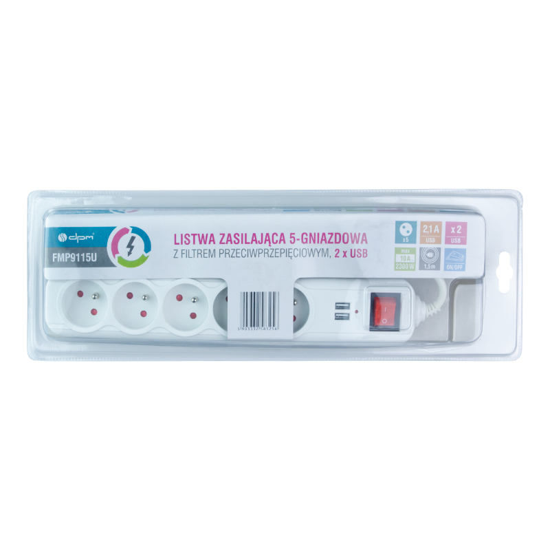 Listwa zasilająca posiada 5 gniazd z bolcami uziemienia , 2 porty USB oraz włącznik centralny.