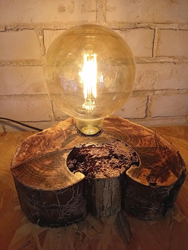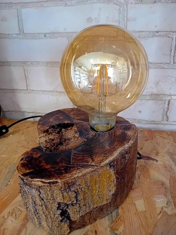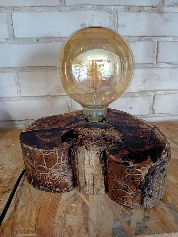Lampa handmade wykonana z kawałka pnia o pięknej orzechowej barwie i z naturalnymi zdobieniami. Doskonale sprawdzi się jako lampa nocna lub stołowa, rozjaśniając wnętrze ciepłą barwą światła.