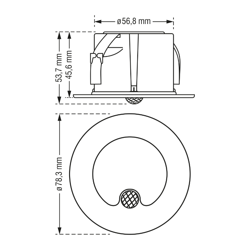 Lampa schodowa DPM jest odpowiednia do montażu podtynkowego w standardowych puszkach elektrycznych o średnicy 60 mm. Głębokość lampy wynosi 45,6 mm, dlatego zaleca się stosowanie tzw. puszek głębokich. Dzięki wbudowanemu zasilaczowi oprawa jest podłączana bezpośrednio do sieci elektrycznej AC 230 V~ bez potrzeby ukrywania w ścianie zasilacza zewnętrznego.