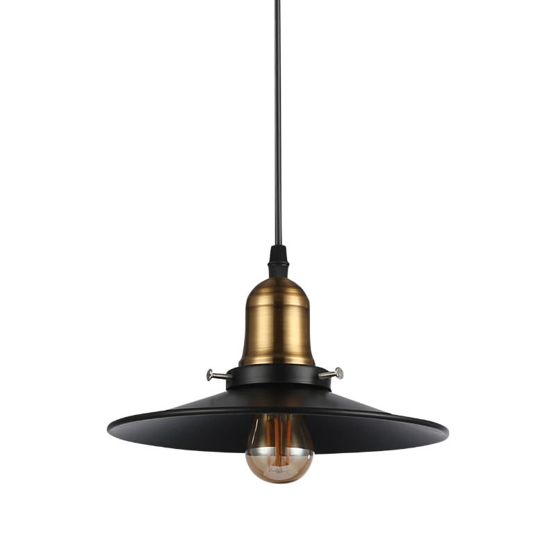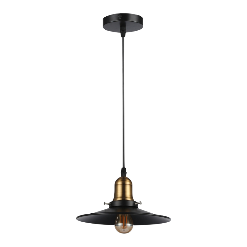 Lampa składa się z aluminiowego czarnego klosza w kształcie dysku oraz metrowego przewodu osadzonego na podstawie o średnicy 10cm. Modna czarno-złota kolorystyka nadaje oprawie szyku i modernistycznego charakteru. Zbudowana z wysokiej jakości materiałów, gwarantuje długie działanie i estetyczny wygląd przez długi okres użytkowania.