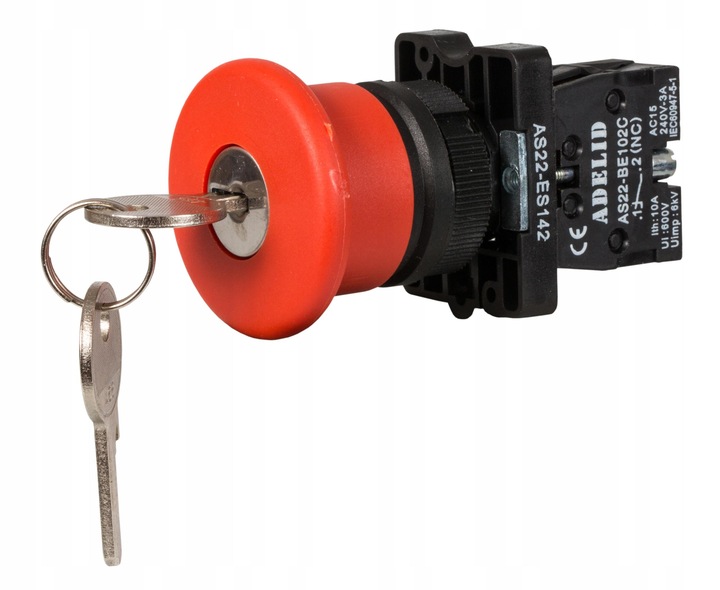Przycisk sterowniczy awaryjny, wyłącznik bistabilny o średnicy grzybka 40mm w kolorze czerwonym został wykonany z metalu. Jest on blokowany poprzez wciśnięcie grzybka i odryglowany poprzez obrót klucza.