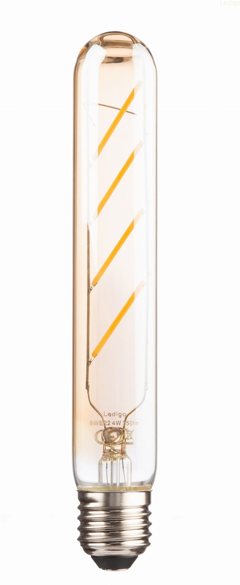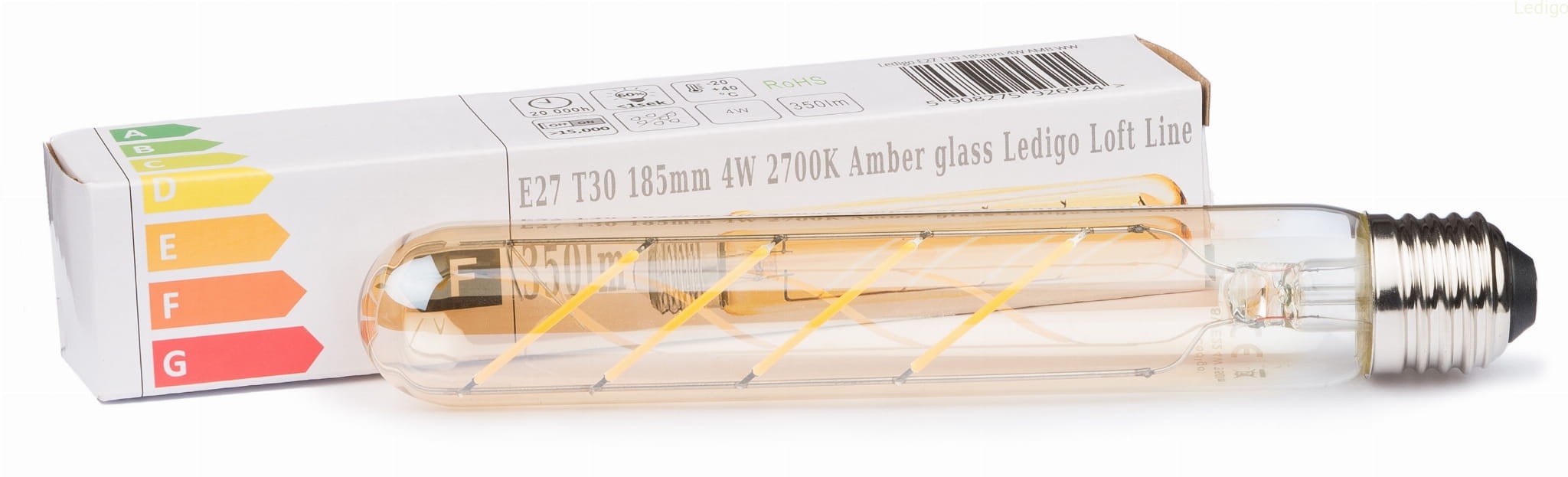 Żarówka dekoracyjna T30 AMBER posiada szkło w delikatnym bursztynowym odcieniu, który nadaje światłu przyjemnej ciepłej barwy (2700K). Produkt jest wysterowana na 80% mocy maksymalnej, aby zapewnić jej długą żywotność. Modny, podłużny kształt żarówki doskonale wpisuje się w stylistykę retro / vintage. Niski pobór mocy 4W daje oszczędność w zużyciu prądu. Żarówka posiada tradycyjny gruby trzonek E27, przez co pasuje do większości opraw i lamp.